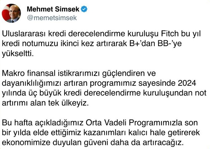 T.C Hazine ve Maliye bakanı Mehmet Şimşek sosyal medya platformundan Fitch kredi notu ile ilgili bilgiyi şu şekilde paylaştı: