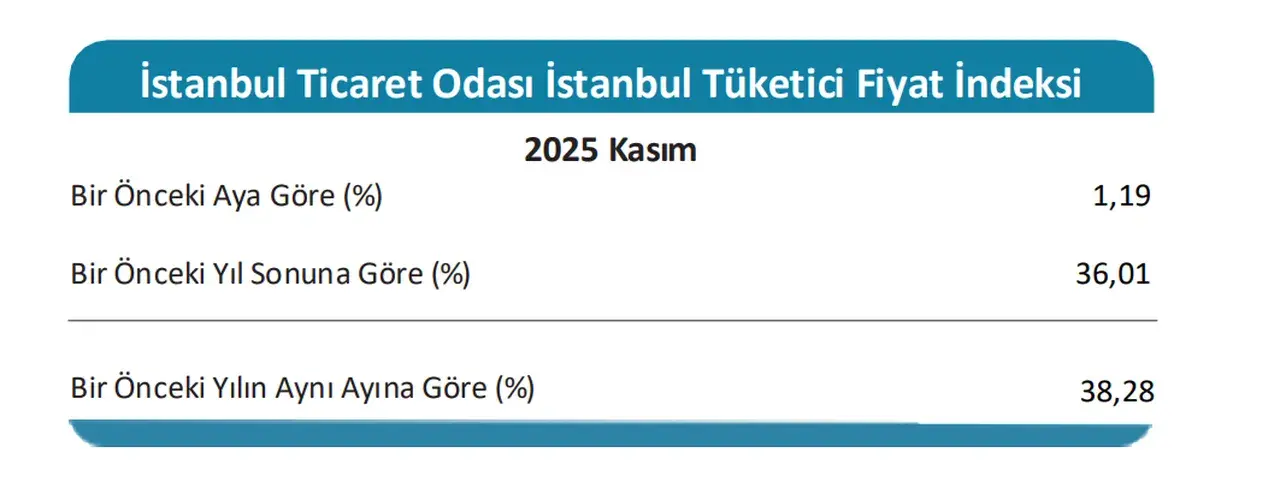 İstanbul Ticaret Odası (İTO), İstanbul Tüketici Fiyat Endeksi raporunu yayımladı. Verilere göre megakentin kasım ayı enflasyonu yüzde 1,19 olurken, yıllık enflasyon yüzde 38,28’e geriledi. Bir önceki ay yıllık enflasyon yüzde 40,84 seviyesindeydi.