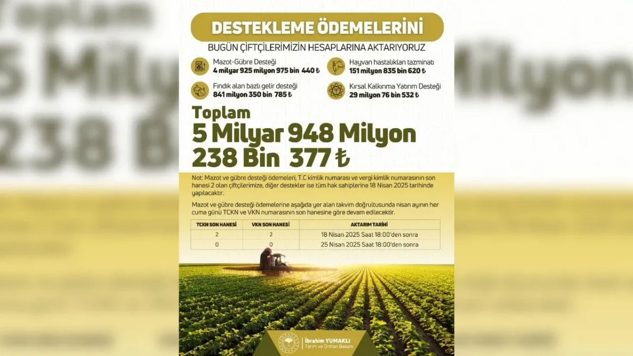Tarım ve Orman Bakanlığı'ndan üreticiye dev destek! Mazot, gübre, fındık geliri, hayvan sağlığı ve kırsal kalkınma yatırımları için toplamda 5 milyar 948 milyon TL'lik ödeme bugün başlıyor.