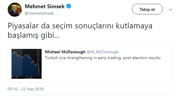 Başbakan Yardımcısı Mehmet Şimşek, 24 Haziran Genel Seçimleri'nin ardından piyasaların tepkisini, twitter hesabından yaptığı açıklamayla değerlendirdi. Şimşek, seçim sonrası TL'nin değer kazanmasıyla ilgili olarak; "Piyasalar da seçim sonuçlarını kutlamaya başlamış gibi ifadelerini kullandı.