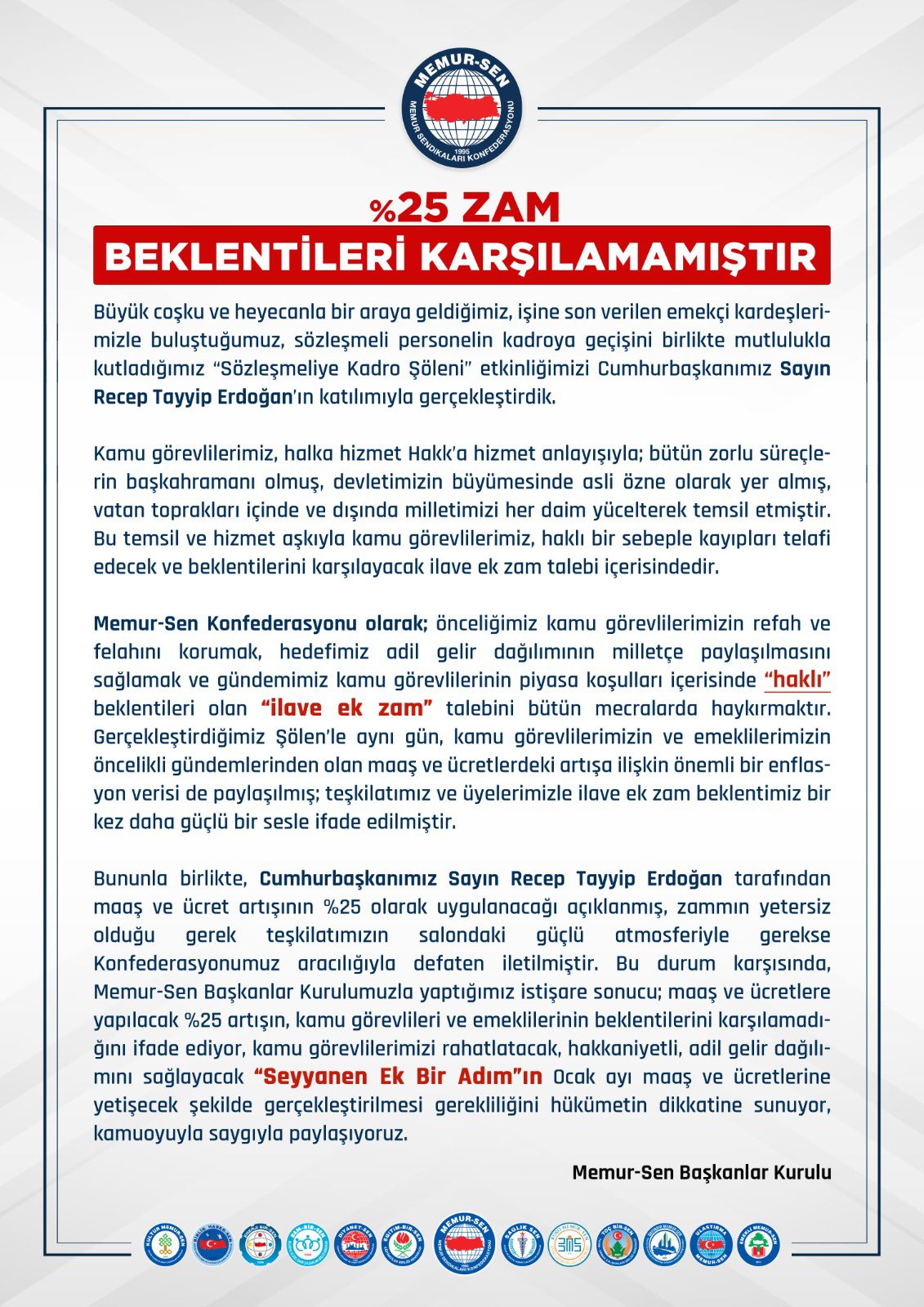 Yapılan açıklamada şu ifadeler kullanıldı; "Memur-Sen Başkanlar Kurulu olarak; %25’in beklentileri karşılamadığını ifade ediyor, “Seyyanen Ek Bir Adım” daha atılması gerekliliğini hükümetin dikkatine sunuyor, talebimizi kamuoyuyla paylaşıyoruz."