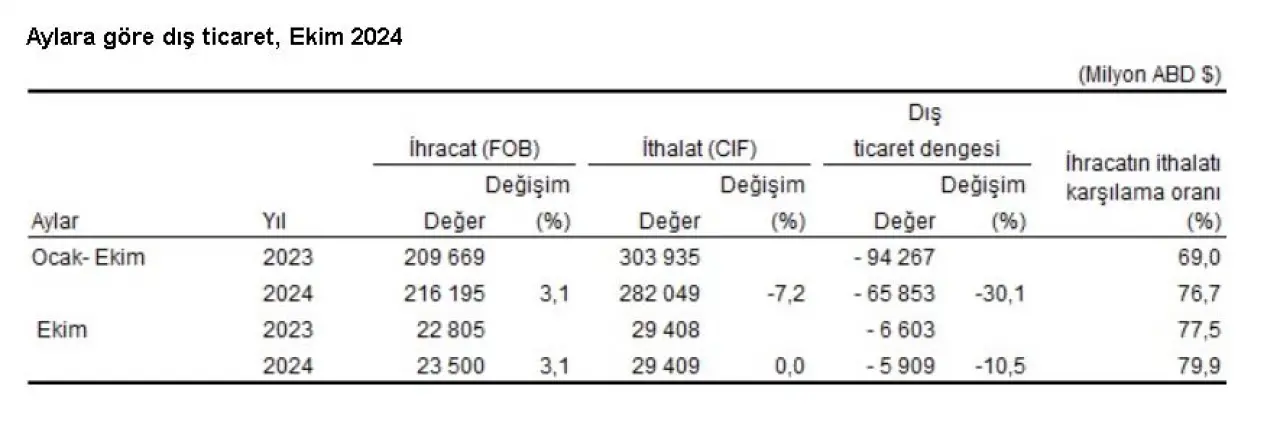 Ekim 2024'te dış ticaret açığı, geçen yılın aynı dönemine göre yüzde 10,5 azalarak 6 milyar 603 milyon dolardan 5 milyar 909 milyon dolara düştü. Bu dönemde ihracatın ithalatı karşılama oranı yüzde 79,9 seviyesine yükseldi. Yılın ilk on aylık döneminde ise dış ticaret açığı, geçen yıla göre yüzde 30,1 azalarak 94 milyar 267 milyon dolardan 65 milyar 853 milyon dolara geriledi. İhracatın ithalatı karşılama oranı ise yüzde 76,7 olarak gerçekleşti.