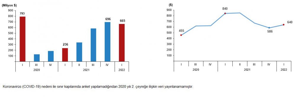 Turizm geliri Ocak, Şubat ve Mart aylarından oluşan I. çeyrekte bir önceki yılın aynı çeyreğine göre %122,4 artarak 5 milyar 454 milyon 488 bin dolar oldu. Turizm gelirinin (cep telefonu dolaşım ve marina hizmet harcamaları hariç) %76,5'i yabancı ziyaretçilerden, %23,5'i ise yurt dışında ikamet eden vatandaş ziyaretçilerden elde edildi.