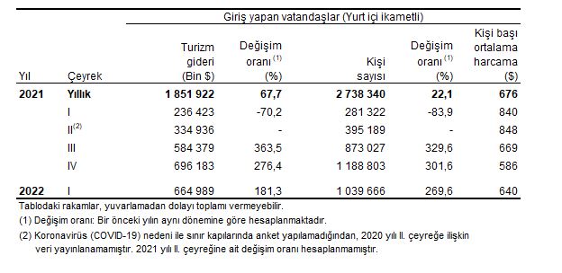 Bu çeyrekte yurt dışını ziyaret eden vatandaş sayısı bir önceki yılın aynı çeyreğine göre %269,6 artarak 1 milyon 39 bin 666 kişi oldu. Bunların kişi başı ortalama harcaması 640 dolar olarak gerçekleşti.