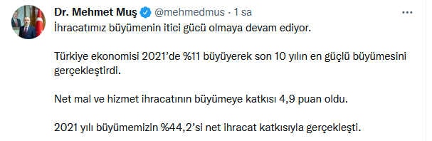 Twitter hesabından açıklama yapan Ticaret Bakanı Mehmet Muş, “İhracatımız büyümenin itici gücü olmaya devam ediyor. Türkiye ekonomisi, 2021'de yüzde 11 büyüyerek son 10 yılın en güçlü büyümesini gerçekleştirdi. Net mal ve hizmet ihracatının büyümeye katkısı 4,9 puan oldu. 2021 yılı büyümemizin yüzde 44,2'si net ihracat katkısıyla gerçekleşti” dedi.