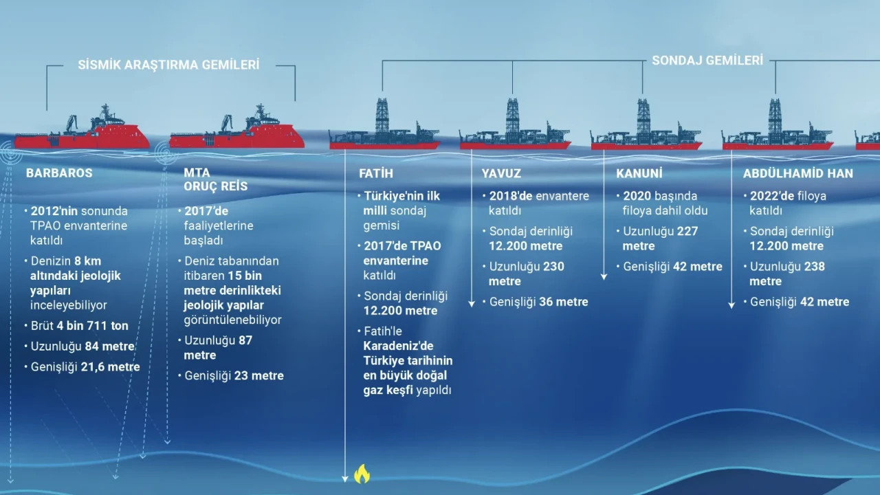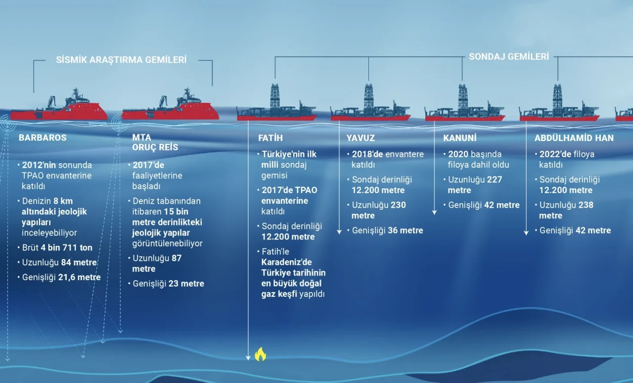 Cumhurbaşkanı Recep Tayyip Erdoğan'ın müjdelediği yeni sondaj gemilerinin filoya katılmasıyla Fatih, Yavuz, Kanuni ve Abdülhamid Han sondaj gemileri, Barbaros Hayrettin Paşa, MTA Oruç Reis sismik arama gemileri ve ilk yüzer doğal gaz üretim platformu Osman Gazi'nin yer aldığı enerji filosundaki gemi sayısı 9'a yükseldi.