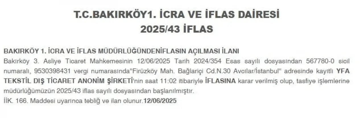 İstanbul Bakırköy 1. İcra ve İflas Müdürlüğü, 2025/43 sayılı dosya kapsamında şirketin resmen iflas ettiğini ve tasfiye işlemlerinin başlatıldığını duyurdu.