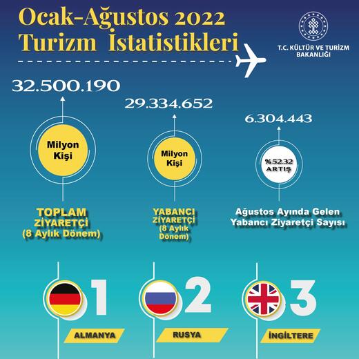 Kültür ve Turizm Bakanlığı'nın Ocak-Ağustos 2022 verilerine göre, Türkiye'yi önceki yılın aynı dönemine göre, yüzde 108,48 artışla 29 milyon 334 bin 652 yabancı ziyaret etti. Yurt dışı ikametli vatandaşla birlikte toplam ziyaretçi sayısı, 32 milyon 500 bin 190 kişiye ulaştı. Ağustos ayında da yabancı ziyaretçi sayısı, yine geçen yılın aynı ayına göre, yüzde 52,32 arttı ve 6 milyon 304 bin 443'e ulaştı.