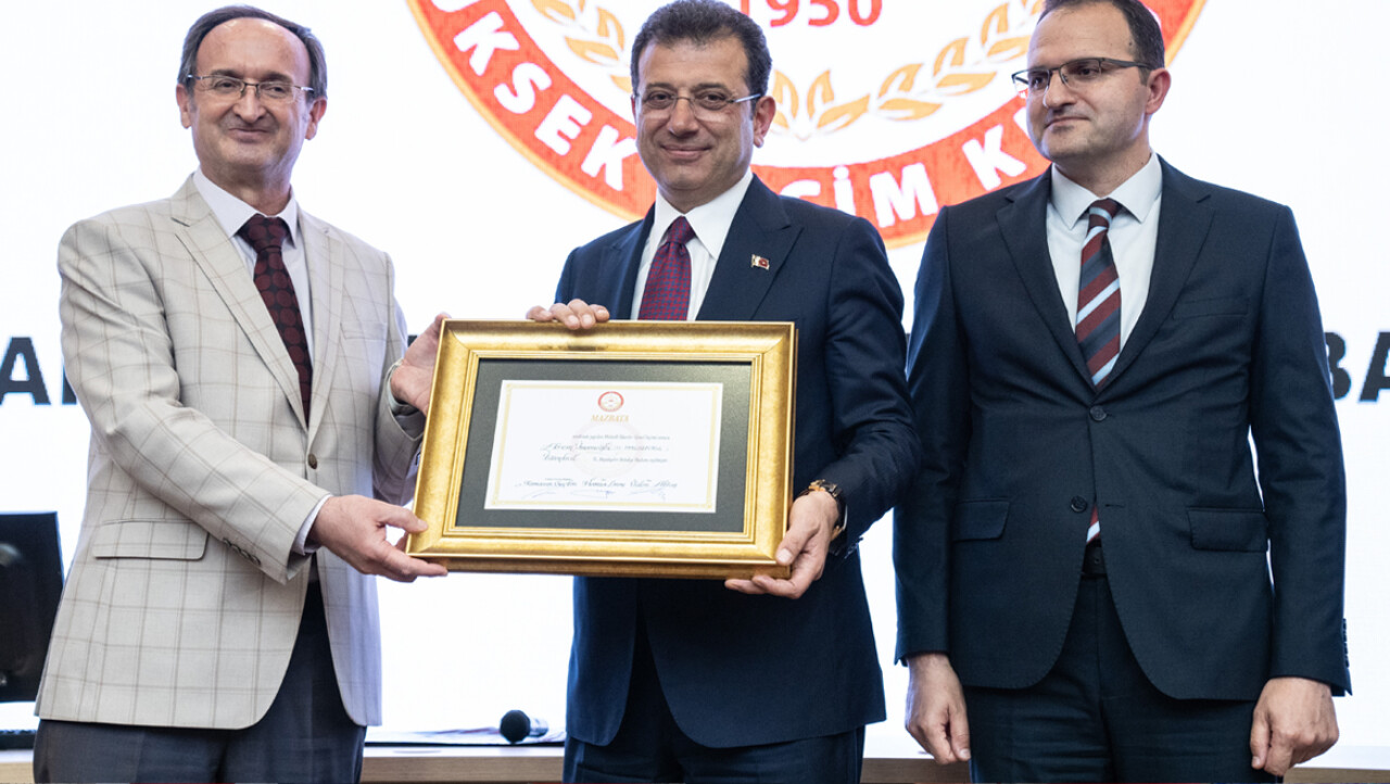 Seçkin'in konuşmasının ardından sahneye davet edilen İmamoğlu, mazbatasını kurul başkanı ve üyelerinin elinden aldı.