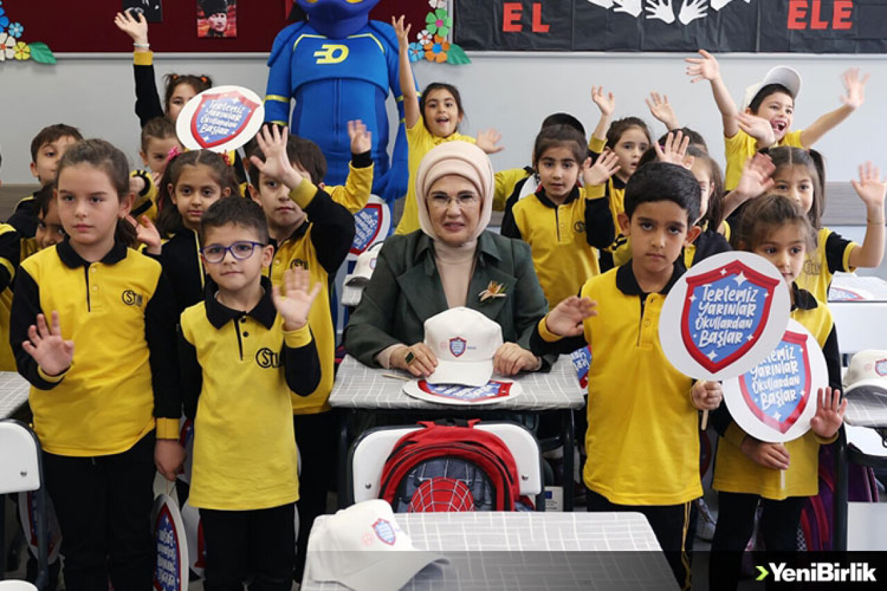 İlkokul 1. sınıfta verilen "hijyen eğitimi" dersine konuk olan Emine Erdoğan, hijyen konusunda sohbet ettiği öğrencilere kitap ve boyama malzemeleri hediye etti.