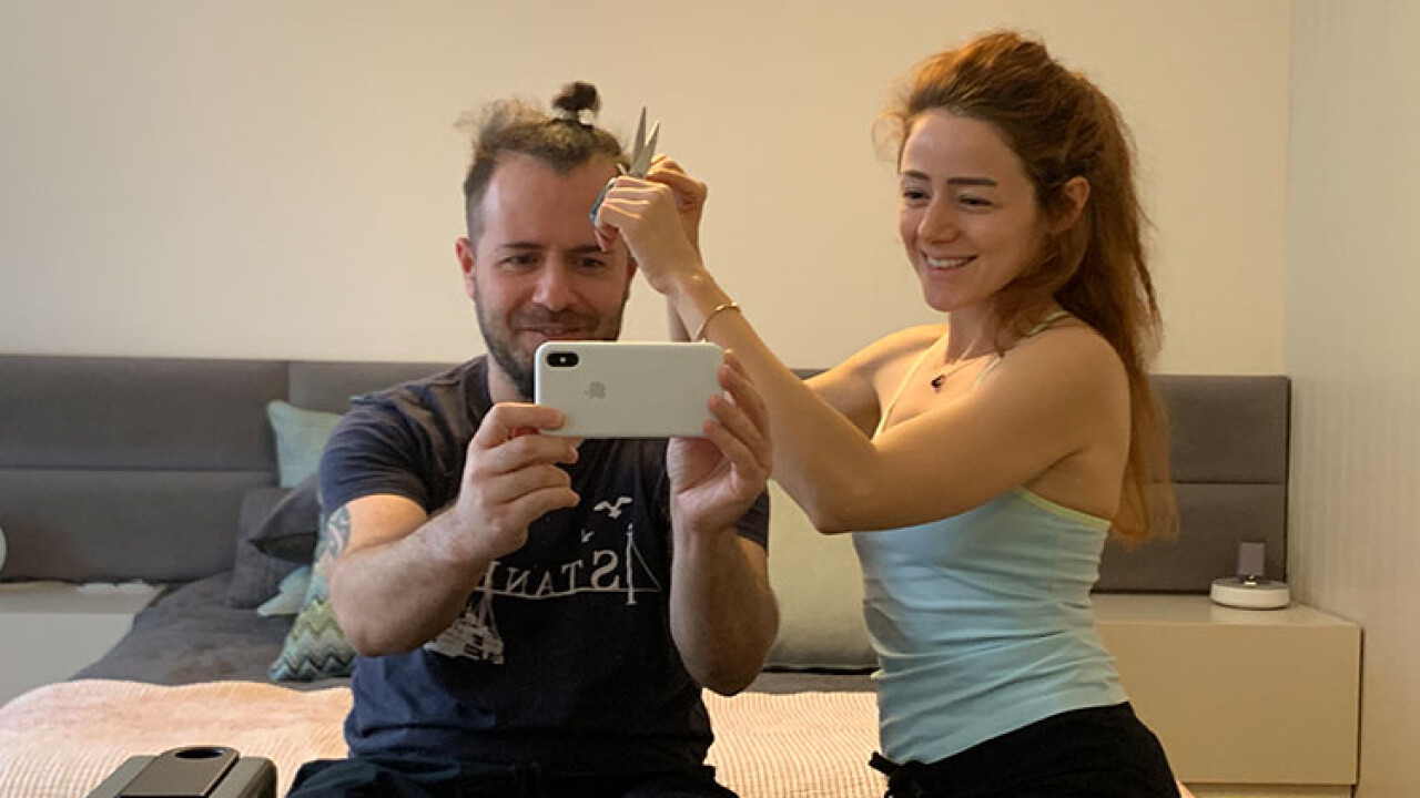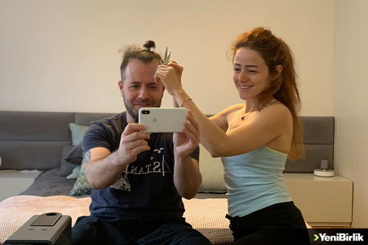 Bir aydan fazladır evinde kendini izole eden başarılı sanatçı Emre Aydın, karantina günlerinde yeni şarkılar üretmeye devam ediyor. Uzun süredir evden çıkmadığı için berbere gidemeyen Emre Aydın, saçlarını eşi Eda Köksal Aydın'a emanet etti.