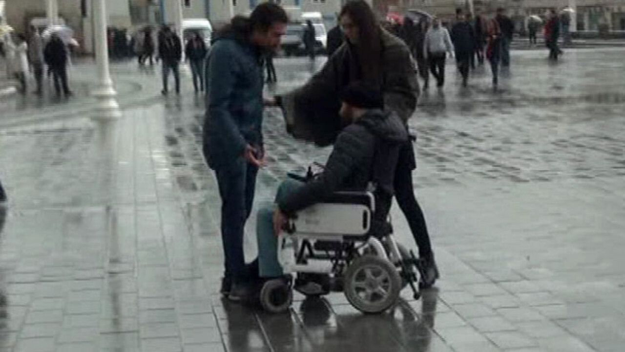Akülü arabasıyla kadına şiddete engel olmaya çalışan engelli Taner Yılmaz vatandaşların duyarsızlığından rahatsız olduğunu söyledi. Tesadüfen olayı gördüğünü açıklayan Yılmaz, “Bugün buraya arkadaşlarımla buluşmak için geldim. Aşağı arabamı bırakıp meydana çıktım. Arkadaşları itişirken gördüm. Kimse müdahale etmedi, gidip vurayım dedim. İnsanlar hiç tepki vermedi, şaşırdım. Bir polisin dışında kimse gelmedi” dedi.