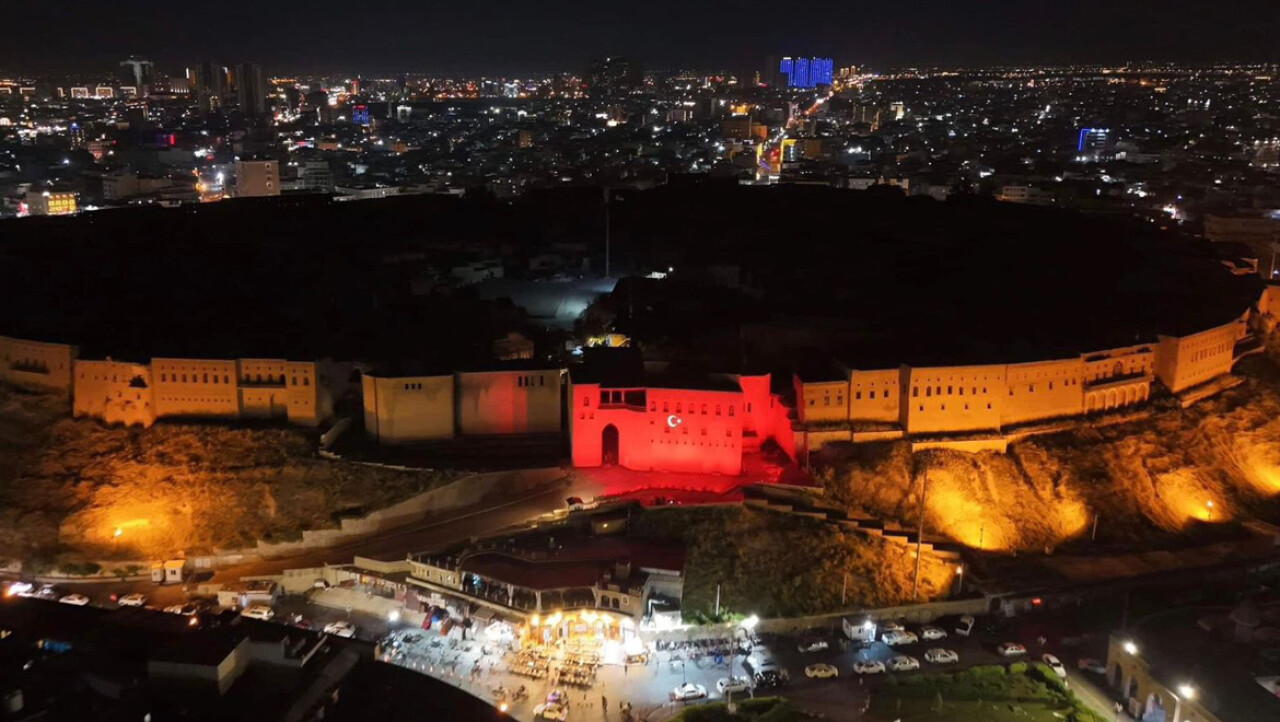 Erbil'de de cadde ve sokaklara Türk bayrakları asılırken Erbil Kalesi'ne Türk bayrağının görüntüsü yansıtıldı.