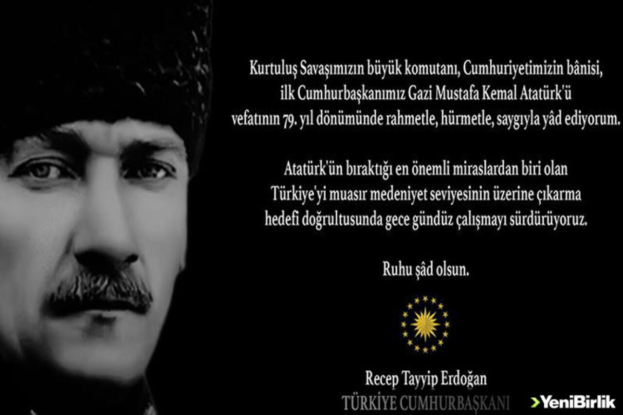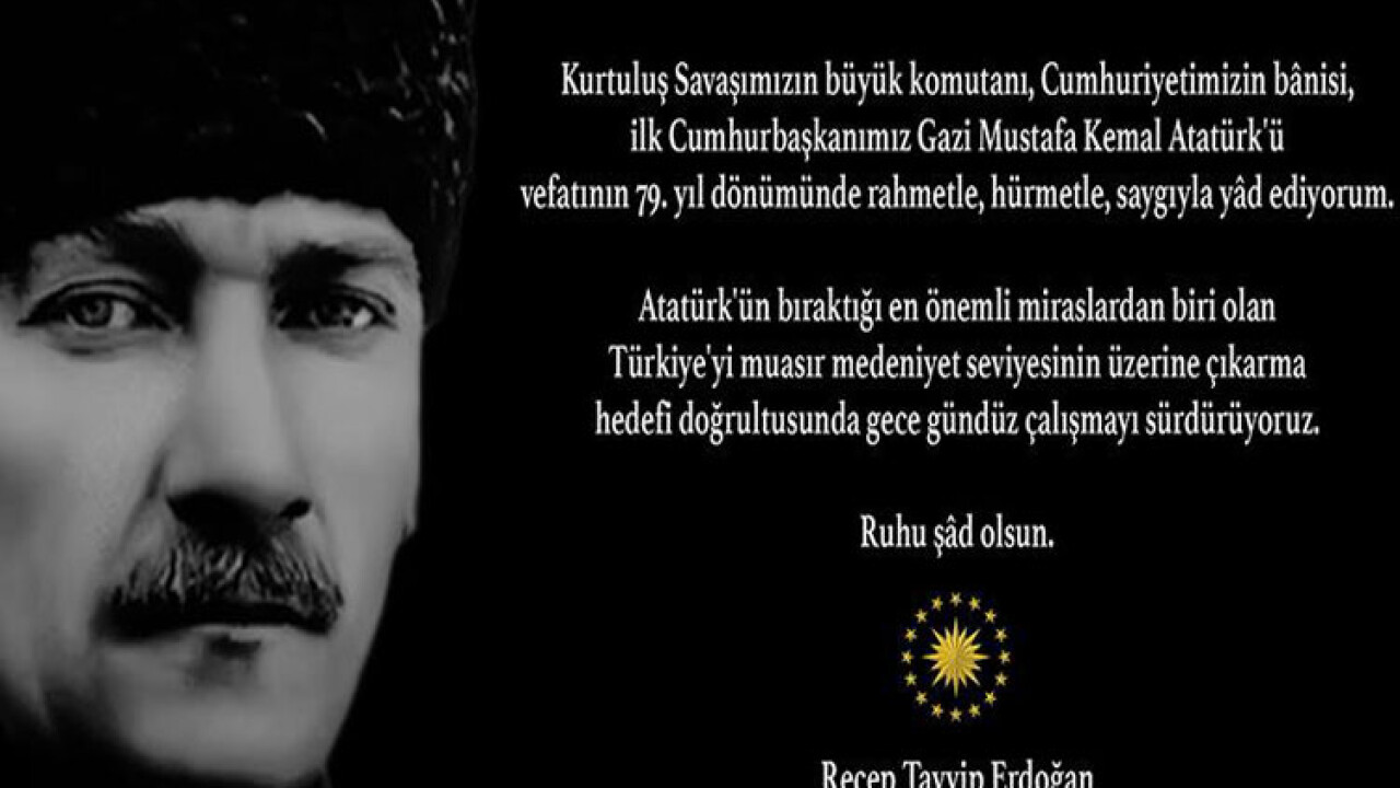 Kurtuluş Savaşı'nın büyük komutanı, Cumhuriyetin banisi, ilk Cumhurbaşkanı Gazi Mustafa Kemal Atatürk'ü vefatının 79. yıl dönümünde rahmetle, hürmetle, saygıyla yad ettiğini belirten Erdoğan, "Atatürk'ün bıraktığı en önemli miraslardan biri olan Türkiye'yi muasır medeniyet seviyesinin üzerine çıkarma hedefi doğrultusunda gece gündüz çalışmayı sürdürüyoruz." ifadesini kullandı.