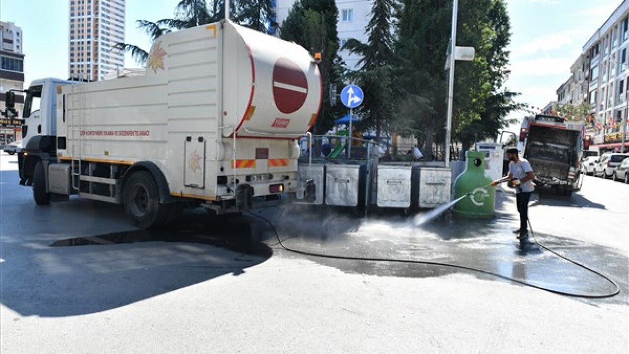 Son olarak Esenyurt Cumhuriyet Meydanı’nda çalışmalarını sürdüren ekipler, konteynerleri mobil araçlarla yıkayarak, bakteri ve kötü koku oluşumunu önlemek amacıyla dezenfekte işlemi gerçekleştirdi. Konteynerlerin boyama ve onarım işlemlerinin ardından meydan süpürülerek tazyikli su ile yıkandı.