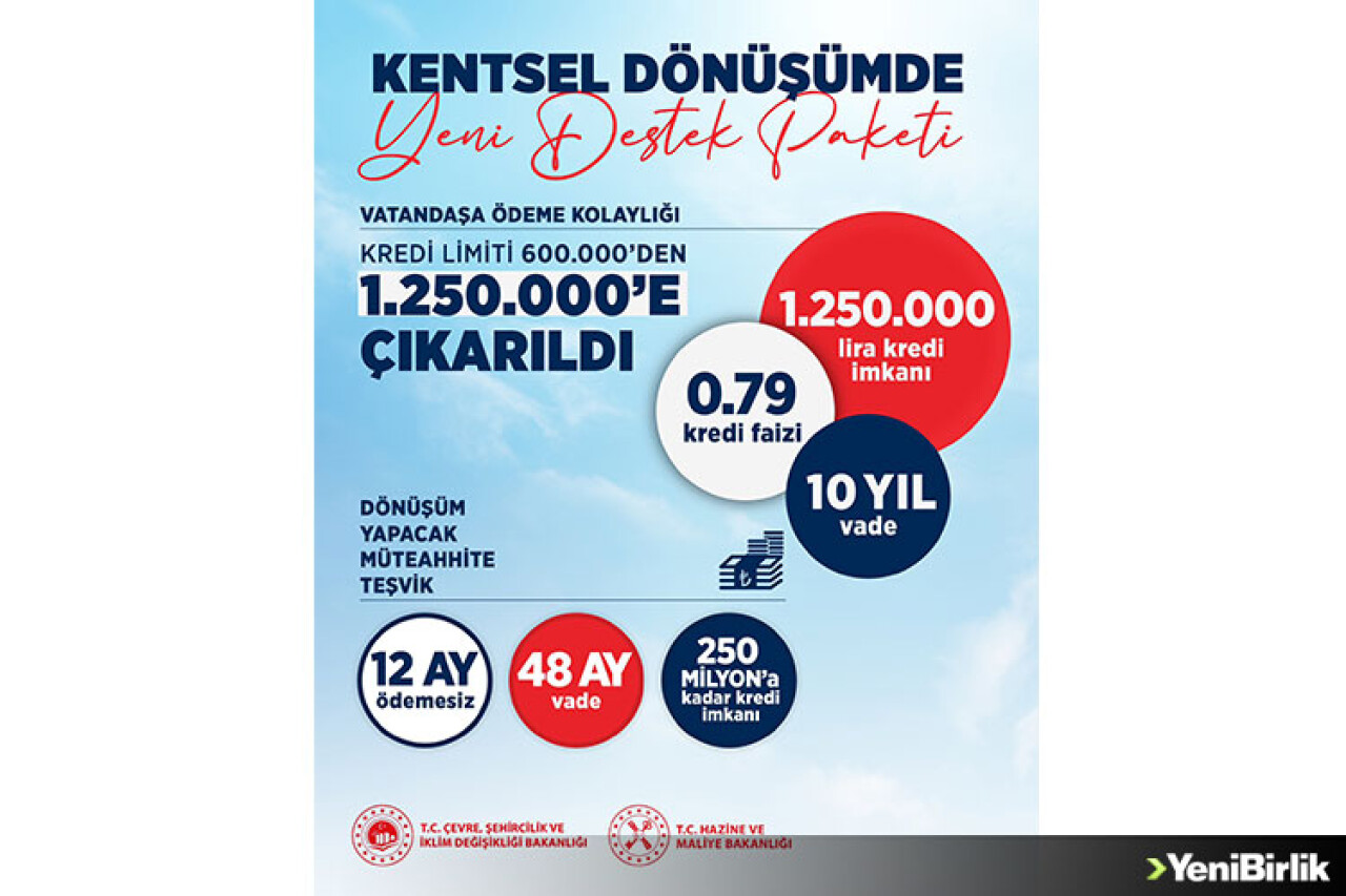 Bu kapsamda; Riskli alanlarda yer alan ya da kendisi riskli yapıların malikleri için 2. Kentsel dönüşüm kapsamında yüklenici ve konut üreticileri için destek paketleri hazırladık. Çevre, Şehircilik ve İklim Değişikliği Bakanlığımızla eşgüdüm içerisinde maliklere yönelik sunduğumuz finansman paketi kapsamında kişi başı 1 milyon 250 bin liraya kadar finansman imkanı sunuyor ve finansman maliyetinin 840 baz puana kadarlık kısmını karşılıyoruz. Paket ile vatandaşlarımızın yaşam şartlarını iyileştirmeleri için önemli bir kolaylık daha sunmuş oluyoruz.
