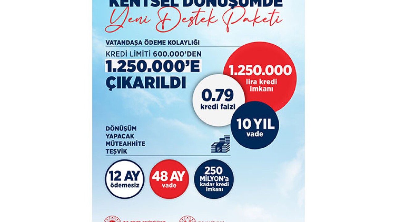 Kentsel dönüşüme yönelik finansman paketi kapsamında kişi başı 1 milyon 250 bin liraya kadar finansman imkanı sunulacak.