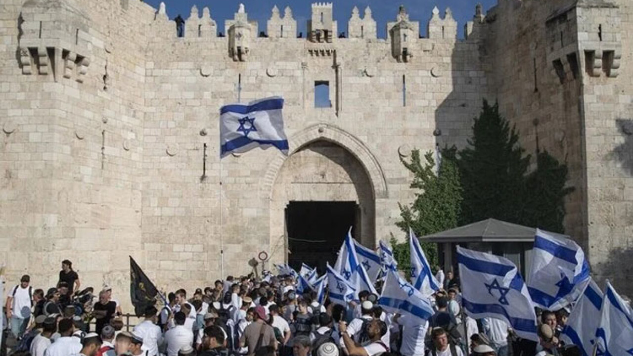 "Bayrak yürüyüşü"nde on binlerce Yahudi yerleşimci, Filistinlilerin yoğunlukta yaşadığı Doğu Kudüs'ün Eski Şehir bölgesinden geçiyor.