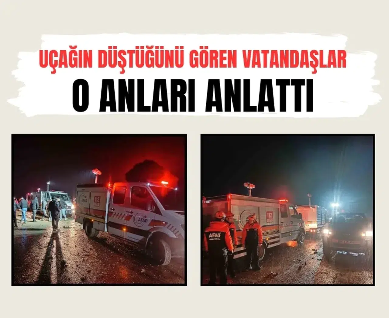 Gazi Özgür’se saat 20.00-21.00 sıralarında yüksek bir patlama sesi duyduğunu ifade ederek, "Bir de yoğun bir sis ve hafif bir yağmur vardı. Patlamanın neticesini bilemediğimizden dolayı anlık haberler yayılmaya başladı. Haberler yayılmaya başlayınca arabaya bindim. Bölgede Jandarma ekipleri dronlarla arama yapıyorlardı. Deprem oluyor ve depremden önce gelen patlama sesi gibi bir ses geldi. Kalıntıları ilk gençler görünce Jandarmaya haber vermişler. Jandarma da olay yerine geldi ve herkesi uzaklaştırdı. Uçağın enkazı bulundu" diye konuştu.