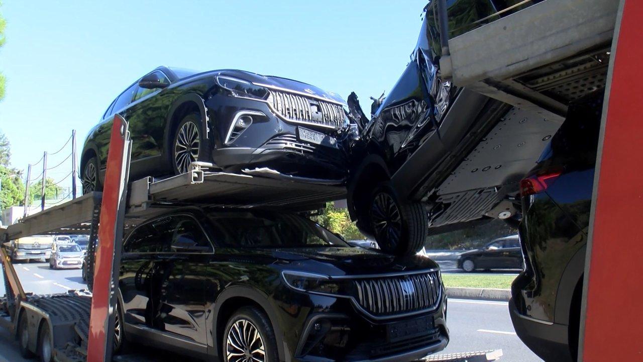4 adet TOGG yüklü olan TIR'ın şoförü Ataköy Marmaray alt geçidinden geçtiği sırada üst kısımda bulunan araç, üst geçide takıldı ve diğer iki araca çarparak askıda kaldı.