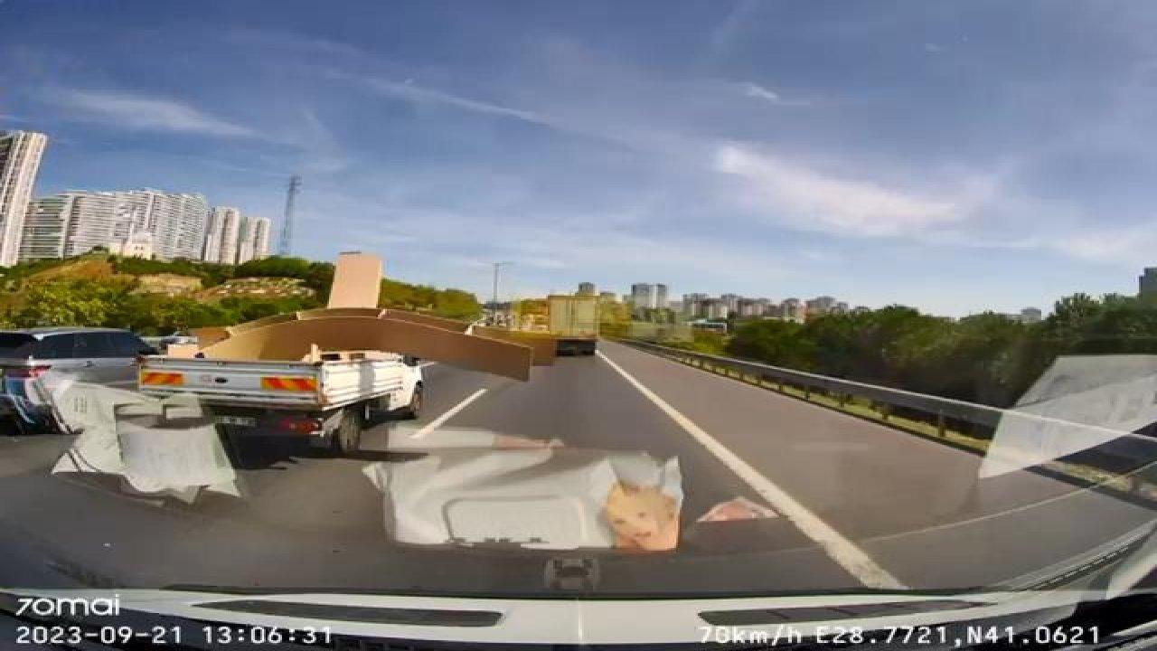 Avcılar'dan Mahmutbey gişelere doğru ilerleyen kamyonetin kasasından uçan malzemeler arkadan gelen sürücülere tehlike yaşattı. O anlar kameraya yansıdı.