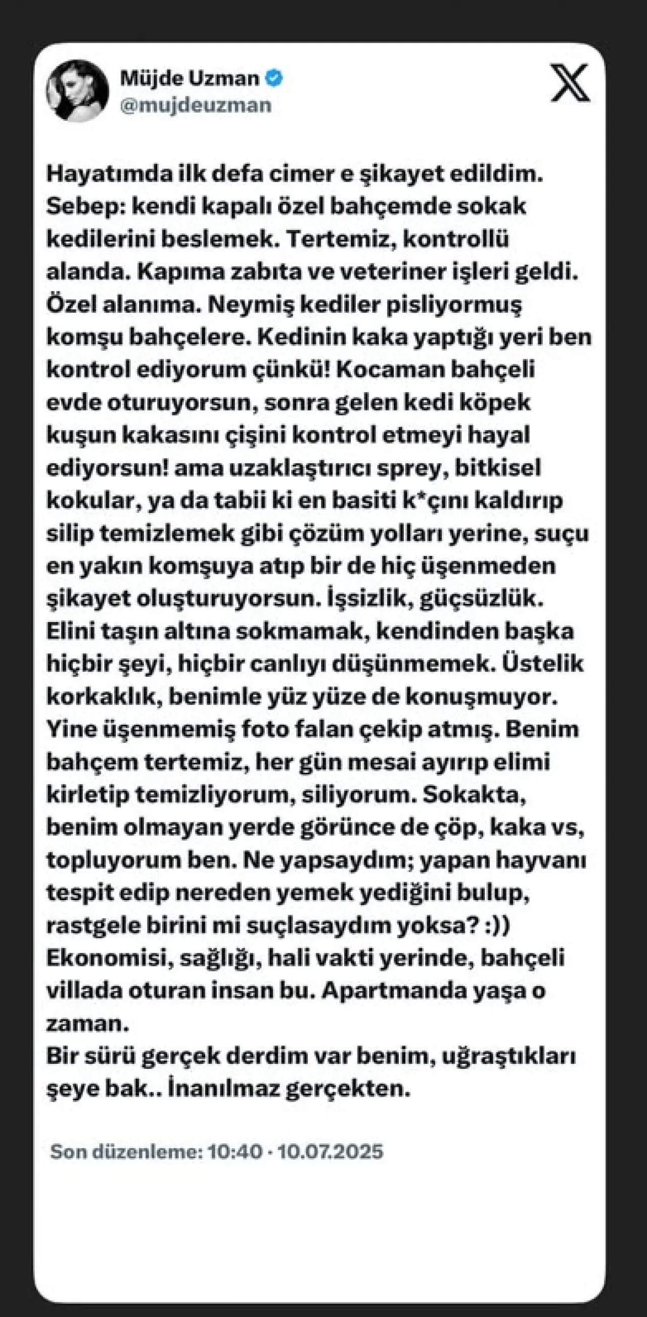 Hayvanseverliğiyle bilinen Müjde Uzman, bu kez hiç beklemediği bir durumla gündeme geldi. Evinin bahçesinde sokak kedileri beslediği için komşusu tarafından CİMER'e şikayet edilen Uzman, yaşadıklarını sosyal medyada paylaştı.