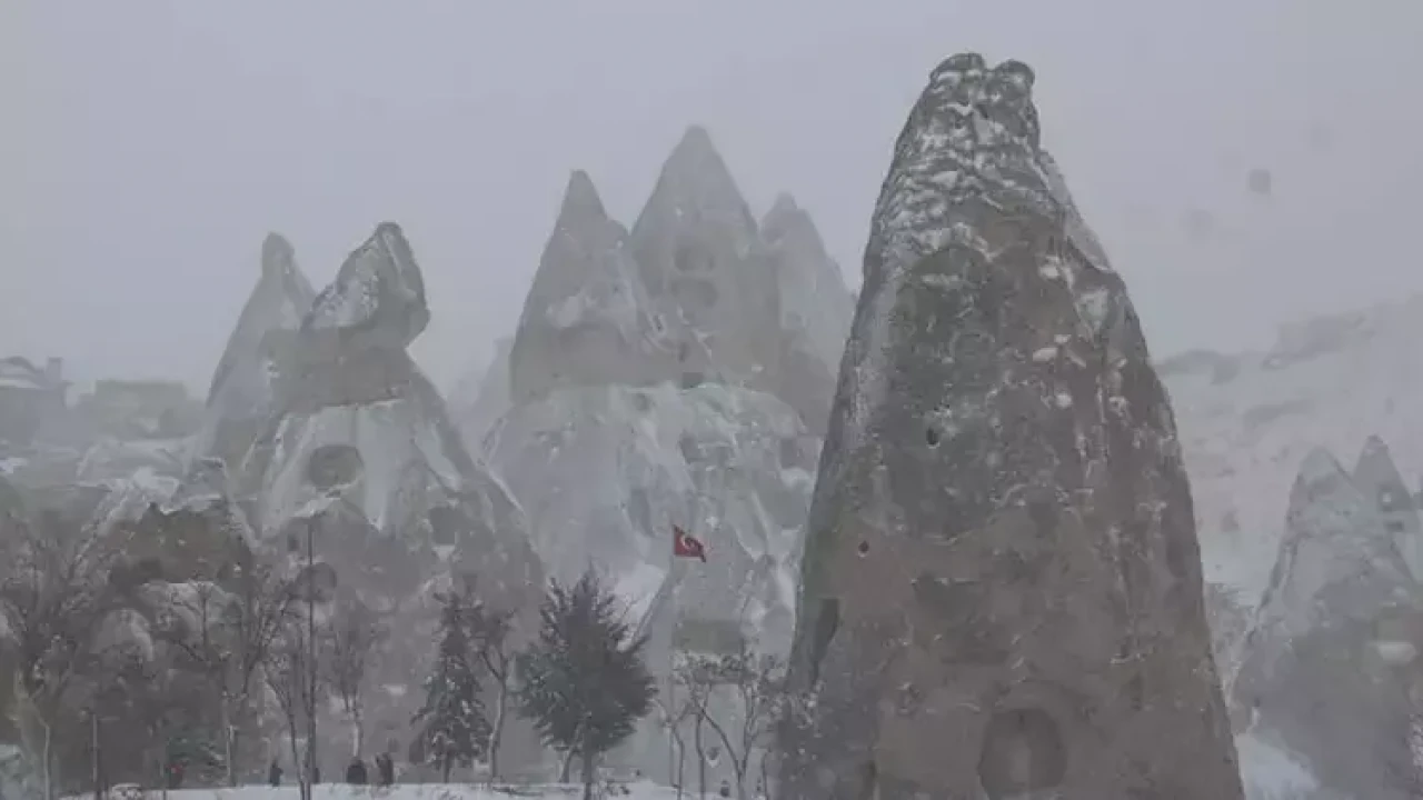Türkiye'nin önemli turizm merkezlerinden Kapadokya, mevsim normallerinin altına düşen hava sıcaklıkları ve etkili olan fırtına ile sağanağın ardından kar yağışıyla beyaz örtüye büründü.