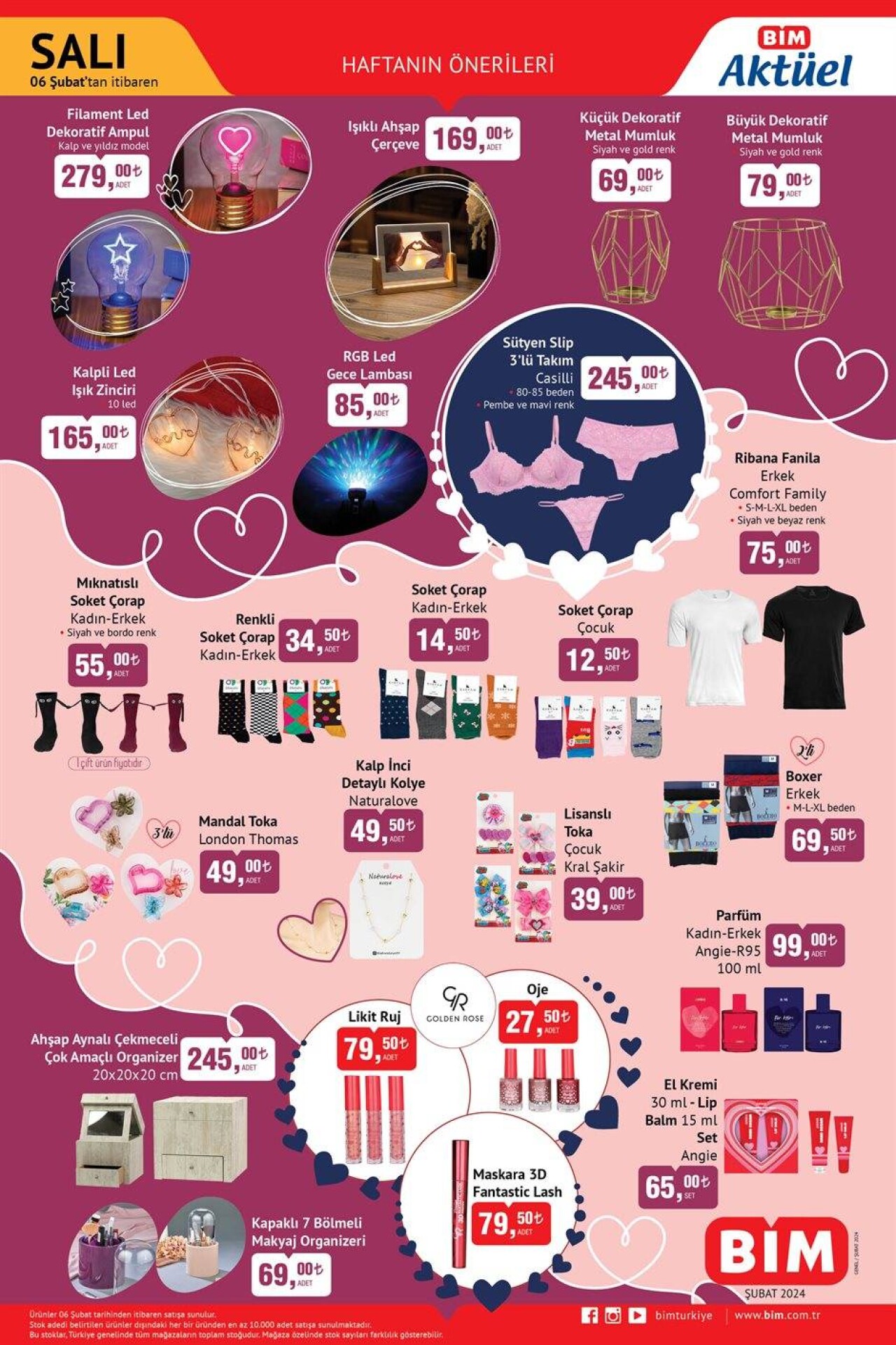 BİM marketlerde başlayacak olan 06-07 Şubat 2024 kampanyalarında beyaz eşyadan Golden Rose marka kozmetik ürünlerine, tişörtten iç giyime, aksesuarlardan zincir ledlere, ev içi aydınlatmalara, tokalardan organizer çeşitlerine, kadın erkek parfümlerinden deterjan çeşitlerine kadar pek çok ürün raflarda yerini alacak.