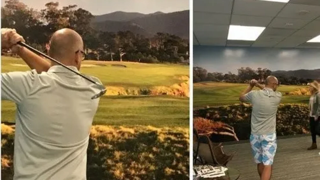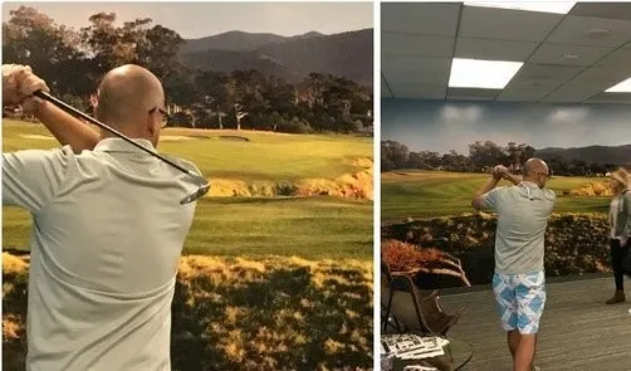 İlk bakışta gerçek bir golf sahasında gibi duruyor. Ancak biraz geri çekilince, aslında sadece duvara yapıştırılmış bir poster önünde poz verdiği anlaşılıyor. Açı her şeyi değiştirir.