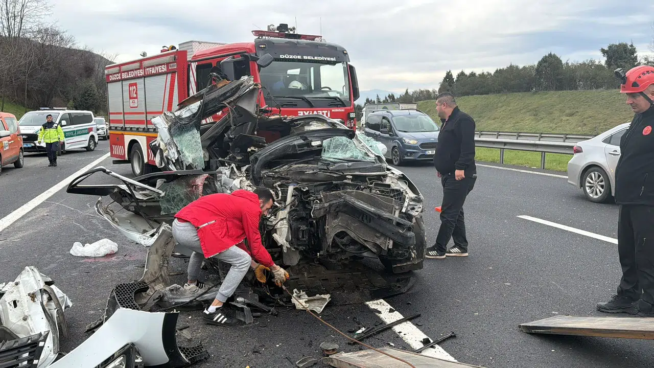 Kaza, saat 14.30 sıralarında Otoyolun Gümüşova rampaları mevkisinde meydana geldi. İstanbul istikametinde seyreden Hamza Güven (25) idaresindeki 34 BZN 727 plakalı otomobil, aynı yönde giden Hayati Erdoğan yönetimindeki 34 AZD 564 plakalı tıra çarptı. Çarpmanın etkisiyle sürücü Güven ile araçta bulunan Muhammed Furkan Bozar (20) otomobilde sıkıştı.