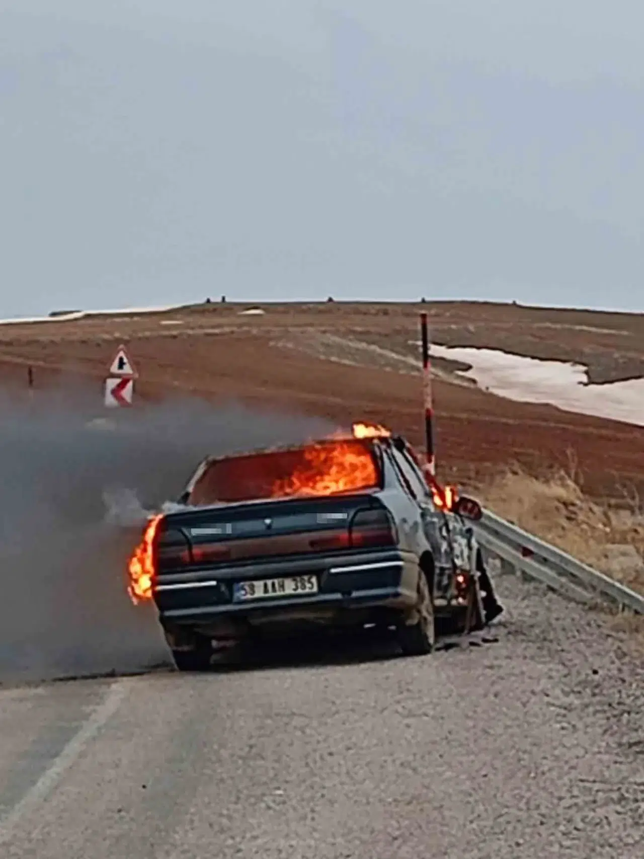 Rüzgarın da etkisiyle büyüyen alev sonrası sürücüsü otomobilden uzaklaştı.