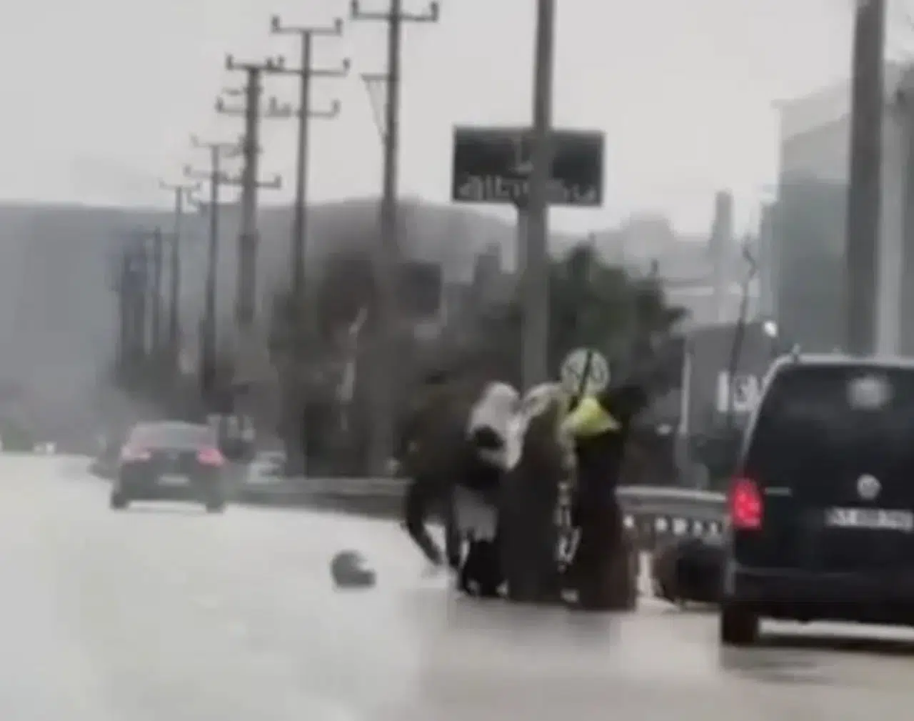 Tartışmanın ardından araçtan inen sürücü, motokuryeyi tekme ve yumruklarla darp etti. O anlar çevrede bulunanların cep telefonu kamerasına yansırken, kavgayı ayırmaya çalışan kadınların çabası sonuç vermedi. Araçtan inen bir çocuğun yaşananları şaşkınlıkla izlediği görüldü.