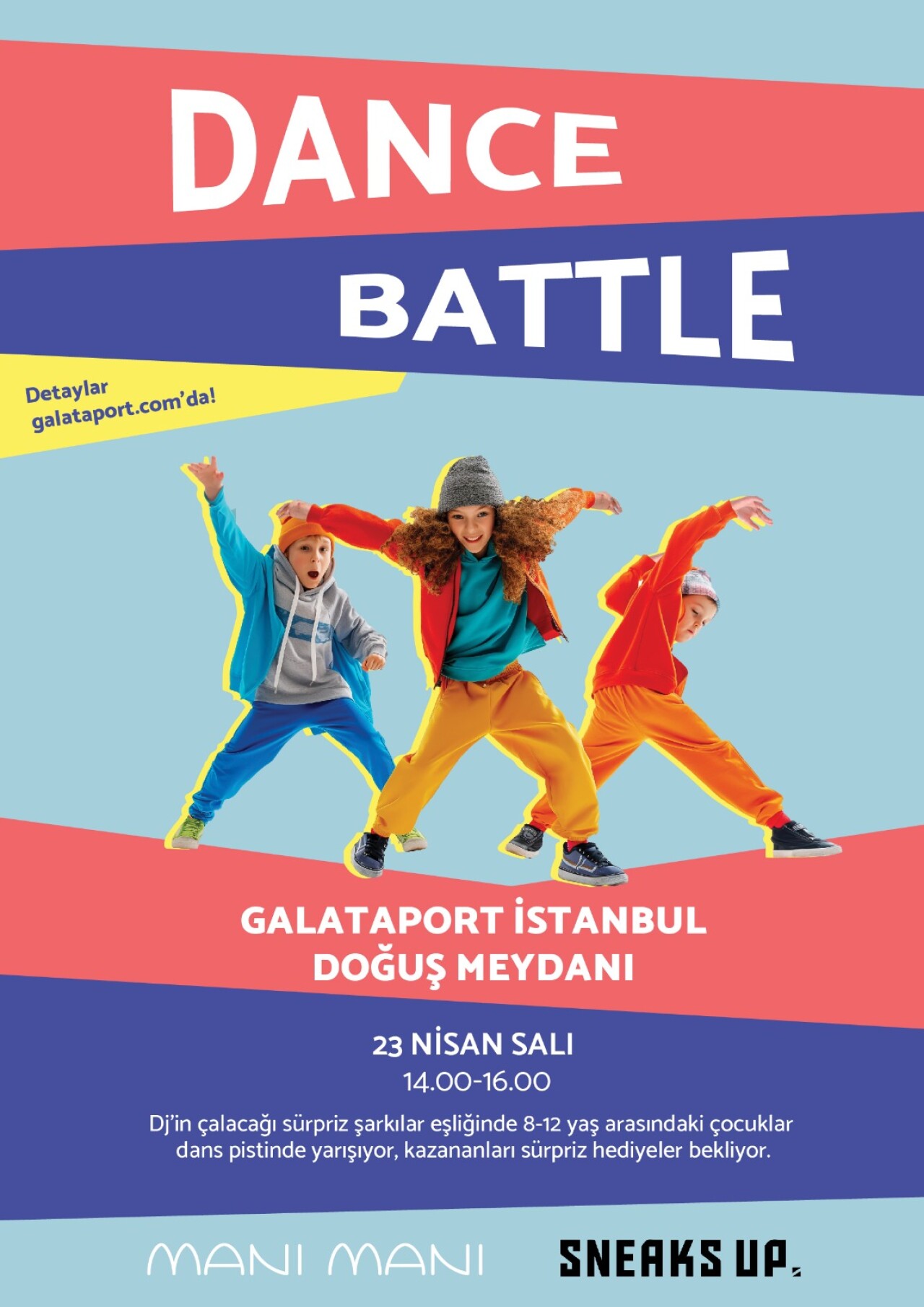 Sokak dansı kültürü ve çocukların yaratıcılığını kutlamak üzere Mani Mani ve Sneaks Up sponsorluğunda gerçekleştirilecek Dance Battle yarışmasında, online video başvuruları onaylanmış 16 çocuk dansçı kıyasıya mücadele ederken, eğlence ve heyecan dolu bir gün geçirecek. DJ’in müzikleri eşliğinde yeteneklerini sergileyecek 8-12 yaş arasındaki çocuklar, jüri oylaması sonucunda sürpriz ödüller kazanma şansını yakalayacak.