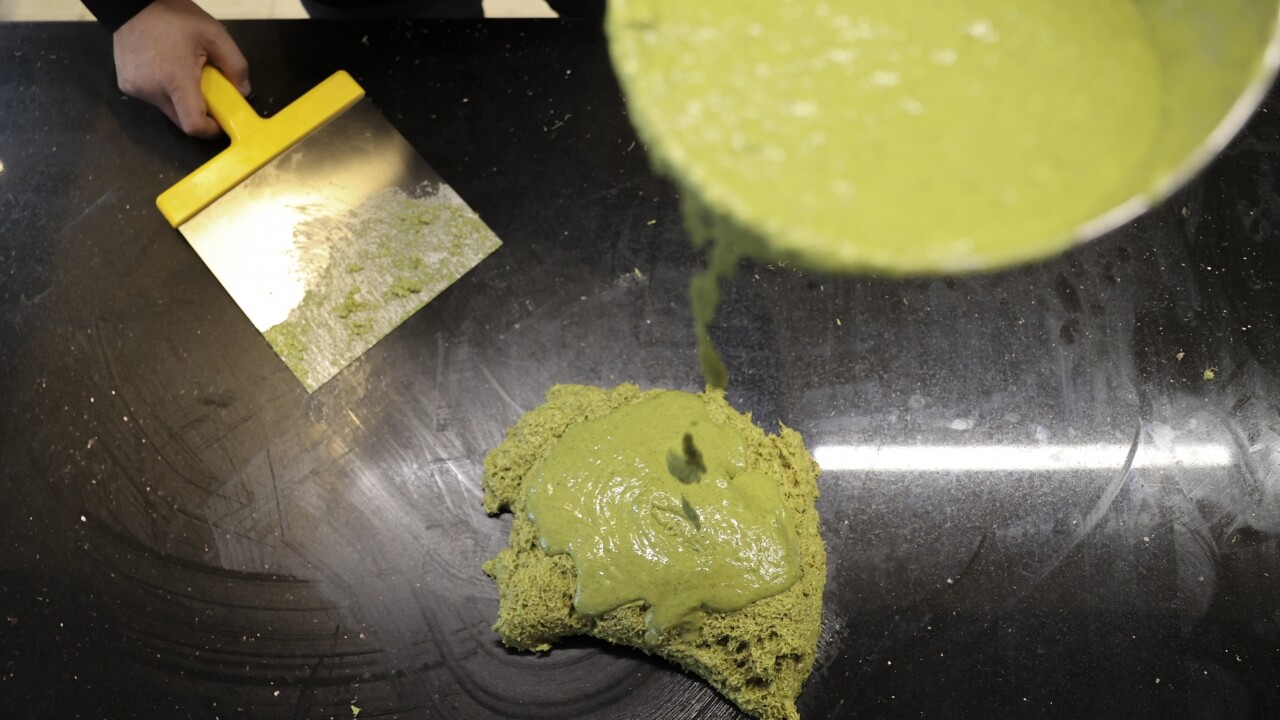 Antep fıstığı ezmesi ile kavrulmuş kadayıfı yoğuran ustalar elde ettikleri karışıma tercihen tahin ekledikten sonra donmuş çikolatanın üzerine yayıyor.