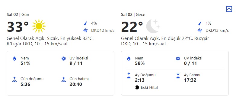 İstanbul'da 02 Temmuz 2024 Salı günü hava güneşli ve açık olacak. Sıcaklık gündüz en yüksek 33 derece, en düşük ise 22 derece olması bekleniyor.