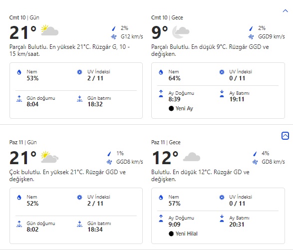 Sıcaklık en yüksek 21, en düşük 12 derece olacak. Rüzgar saatte değişkenlik gösterecek. Nem %57 olacak.