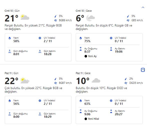 Rüzgar saatte değişkenlik göstererek esecek. Nem %65 seviyesinde olacak.
