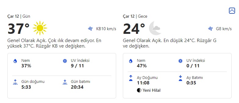 Gündüz Bursa'da en yüksek sıcaklık 37 dereceye yükselirken, gece ise sıcaklık 24 derece ölçülecek. Rüzgar saatte değişkenlik göstererek eserken nem oranı ise yüzde 37 olacak.