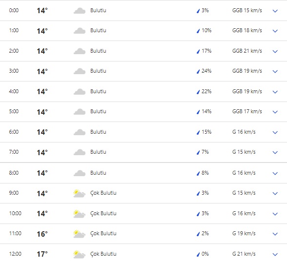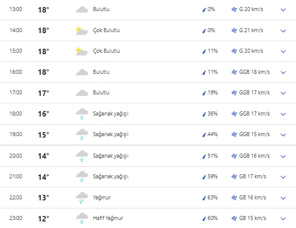 Nem %90 olurken, rüzgar da kuvvetli etkisini yitirecek ve 15-30 km arasında esecek. Saatlik hava durumu verileri aşağıdadır.