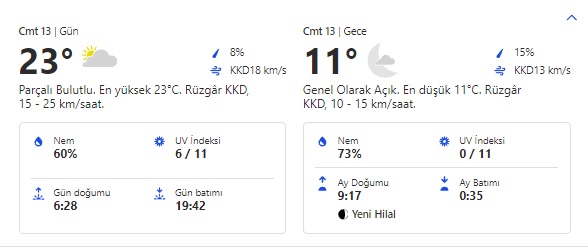 İstanbul'da 13 Nisan 2024 Cumartesi günü hava parçalı bulutlu olacak. Sıcaklık en yüksek 23, en düşük ise 11 derece olacak.