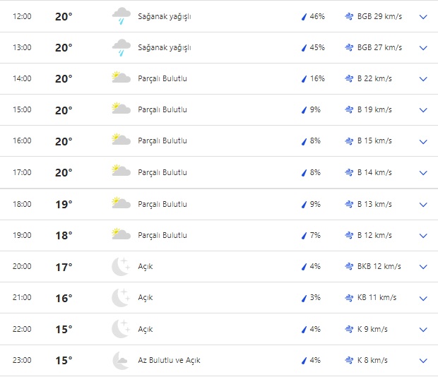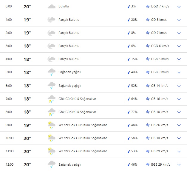 Sıcaklık gündüz en yüksek 21, gece ise en düşük 14 derece olacak. Akşam 20:00 civarında gök gürültülü sağanak yağış yerini sağanak yağmura çevirecek. Yağmur yağma ihtimali yüzde 80 iken, rüzgar saatte 25-40 km hızla esecek.