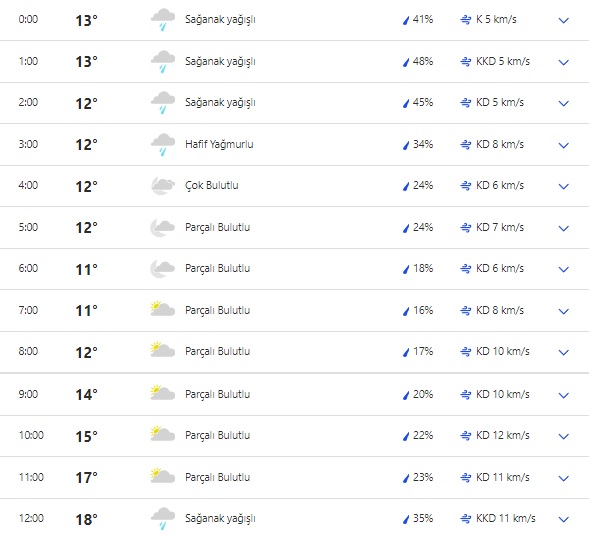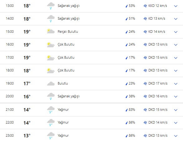 Sıcaklık en yüksek 20, en düşük ise 10 derece olması bekleniyor. Rüzgar saatte 10-15 km hızla esecek. Nem yüzde 80 olacak. Yağmur yağma ihtimali yüzde 100 olurken, lokal olarak sel olma riski bulunuyor.