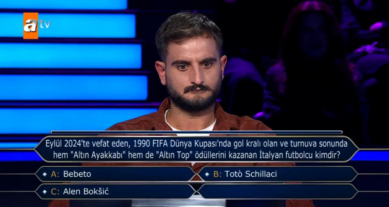 ATV’nin sevilen bilgi yarışması programı Kim Milyoner Olmak İster?’de futbolseverleri heyecanlandıran bir soru soruldu: Eylül 2024'te vefat eden, 1990 FIFA Dünya Kupası'nda gol kralı olan ve turnuva sonunda hem "Altın Ayakkabı" hem de "Altın Top" ödüllerini kazanan İtalyan futbolcu kimdir? Bu soru, futbol tarihine damga vurmuş bir ismi, Salvatore 'Toto' Schillaci'yi konu alıyordu. Bu yazıda, Schillaci’nin hayatını, futbol kariyerindeki unutulmaz başarılarını ve 1990 Dünya Kupası'ndaki etkileyici performansını ele alacağız.