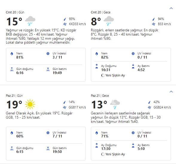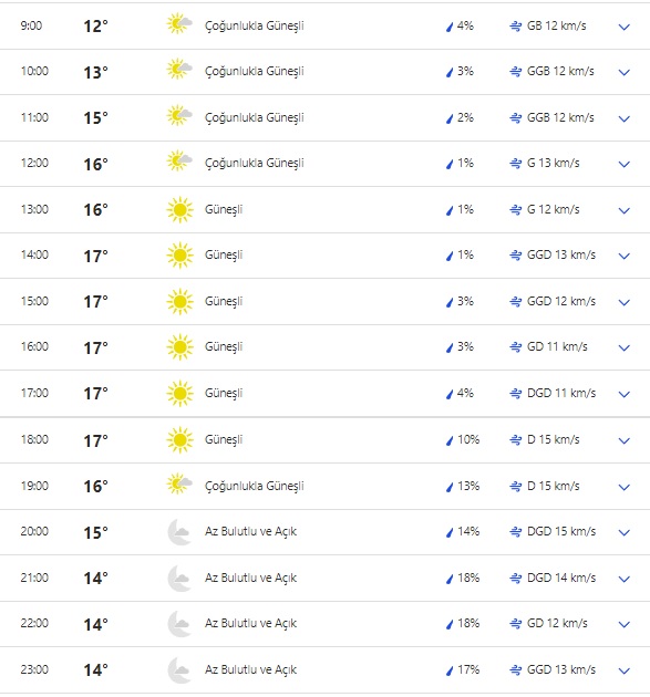 Sıcaklık en yüksek 17, en düşük ise 9 derece olması bekleniyor. Yağmur akşam saatlerinde yüzde 40 ihtimalle yağması bekleniyor.