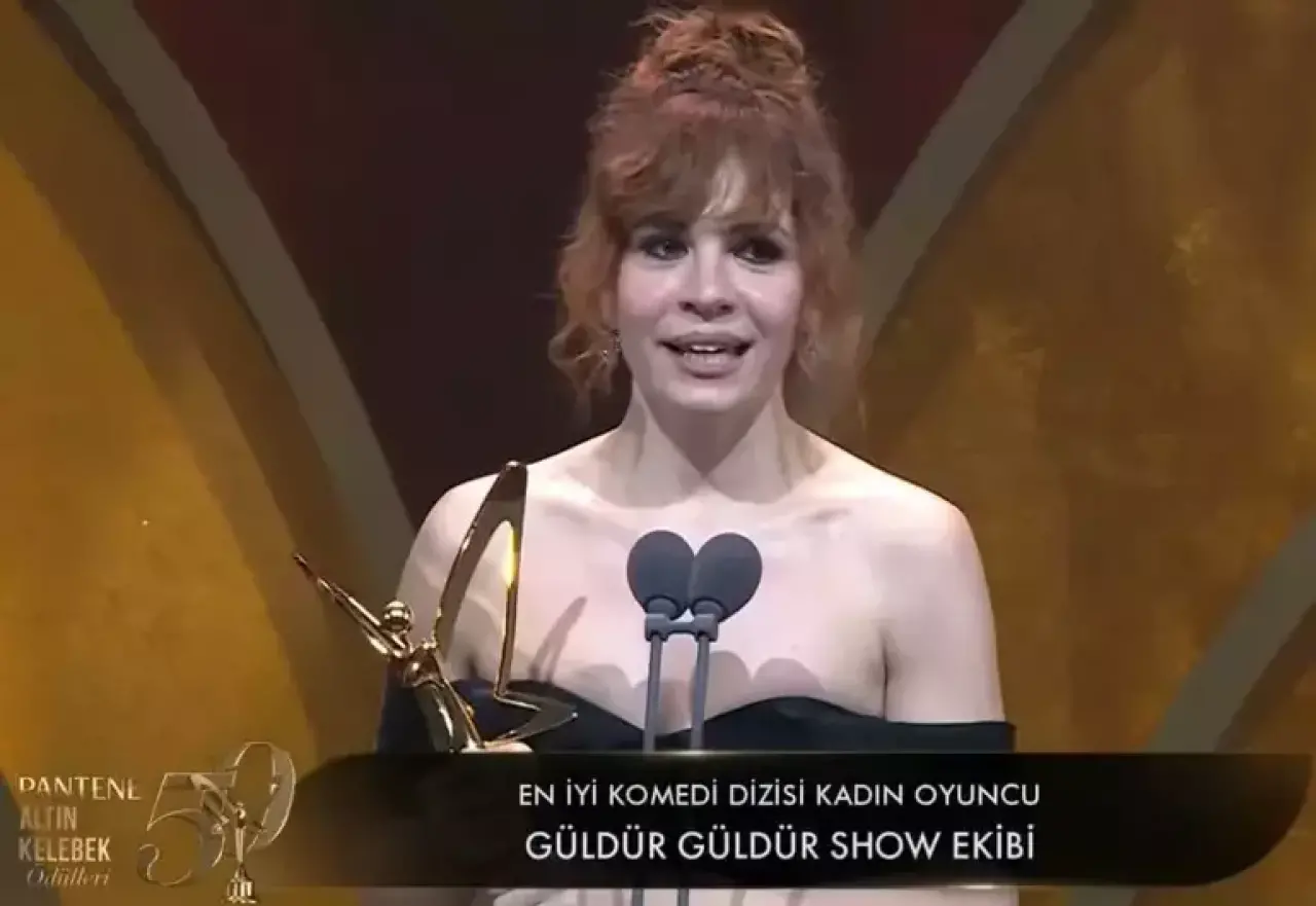 En İyi Komedi Dizisi Kadın Oyuncu: Güldür Güldür ekibi (Show TV) Ödülü ekibi adına Aylin Kontente, oyuncu Selim Bayraktar'ın elinden aldı.