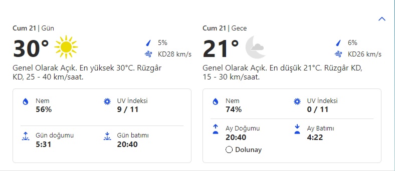 Termometrelerde sıcaklık en yüksek gündüz 30, en düşük ise 21 derece ölçülmesi tahmin ediliyor. Megakentte rüzgar saatte 25 ila 40 km hızla esmesi bekleniyor. Nem oranı ise yüzde 56 olması öngörülüyor.
