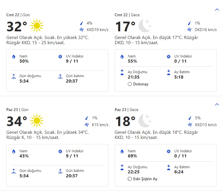 Gündüz en yüksek sıcaklık 32, en düşük ise 17 derece olması bekleniyor. Rüzgar ise saatte 15 ila 25 km hızla esecek. Nem yüzde 50 olacak.