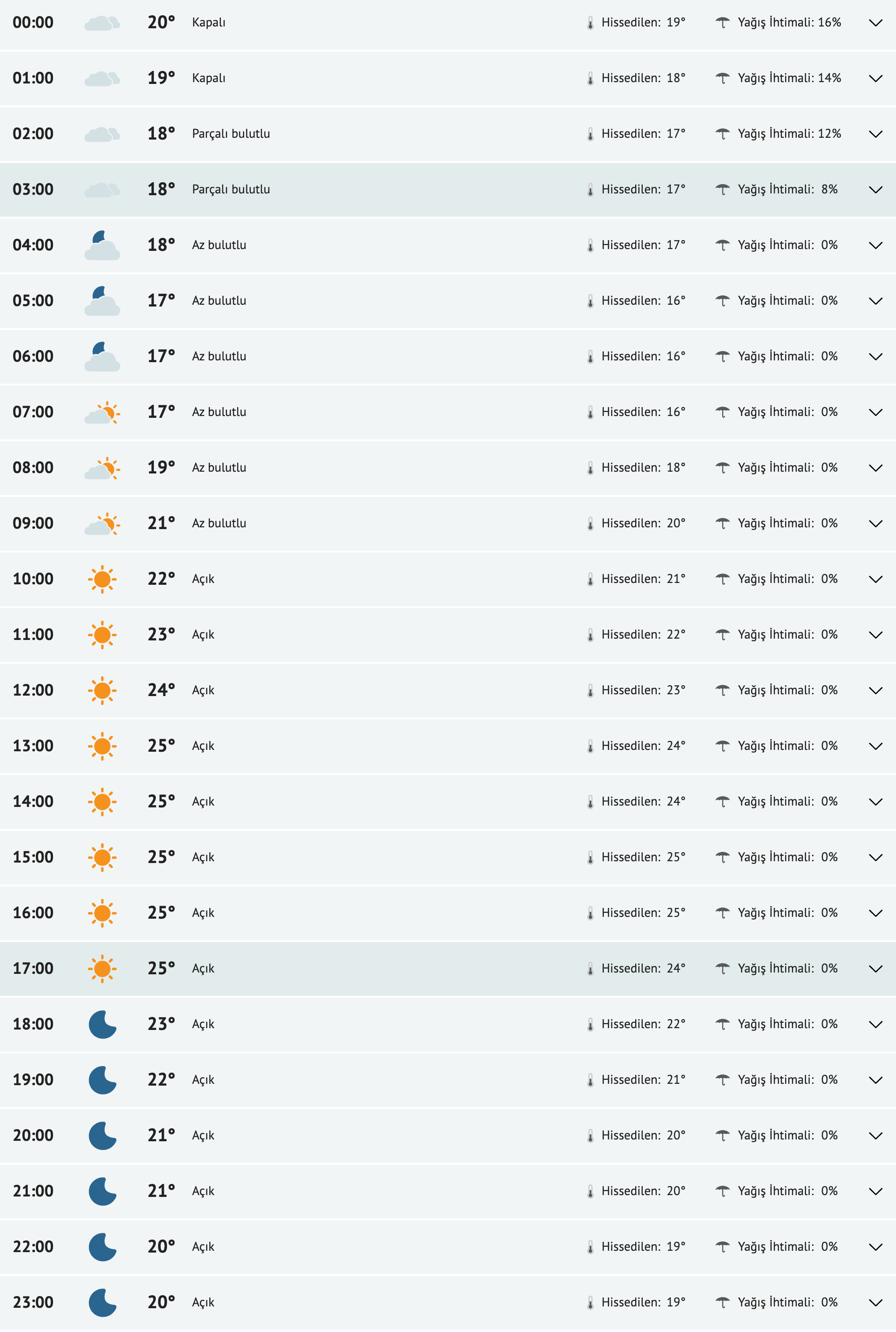 Havanın açık, en yüksek sıcaklığın 25° ve en düşük sıcaklığın 17° olması bekleniyor.