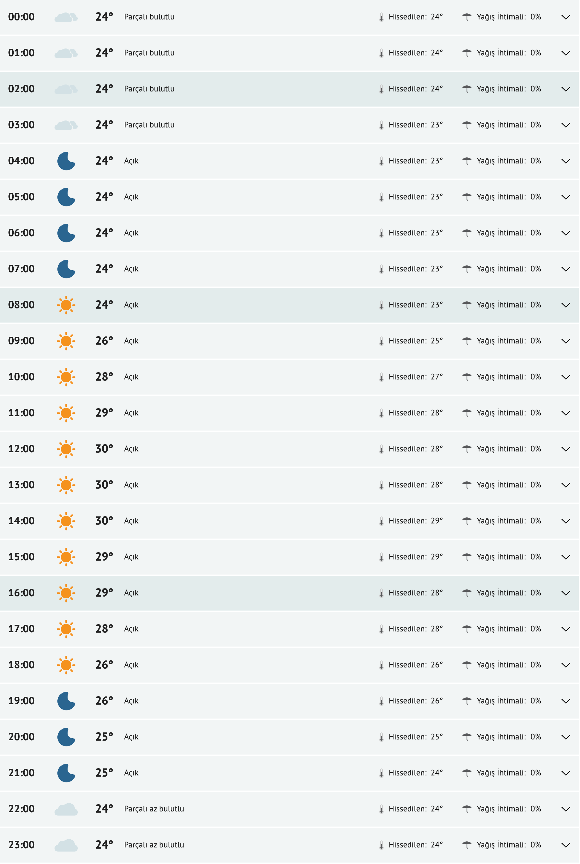 Havanın açık, en yüksek sıcaklığın 30° ve en düşük sıcaklığın 24° olması bekleniyor.