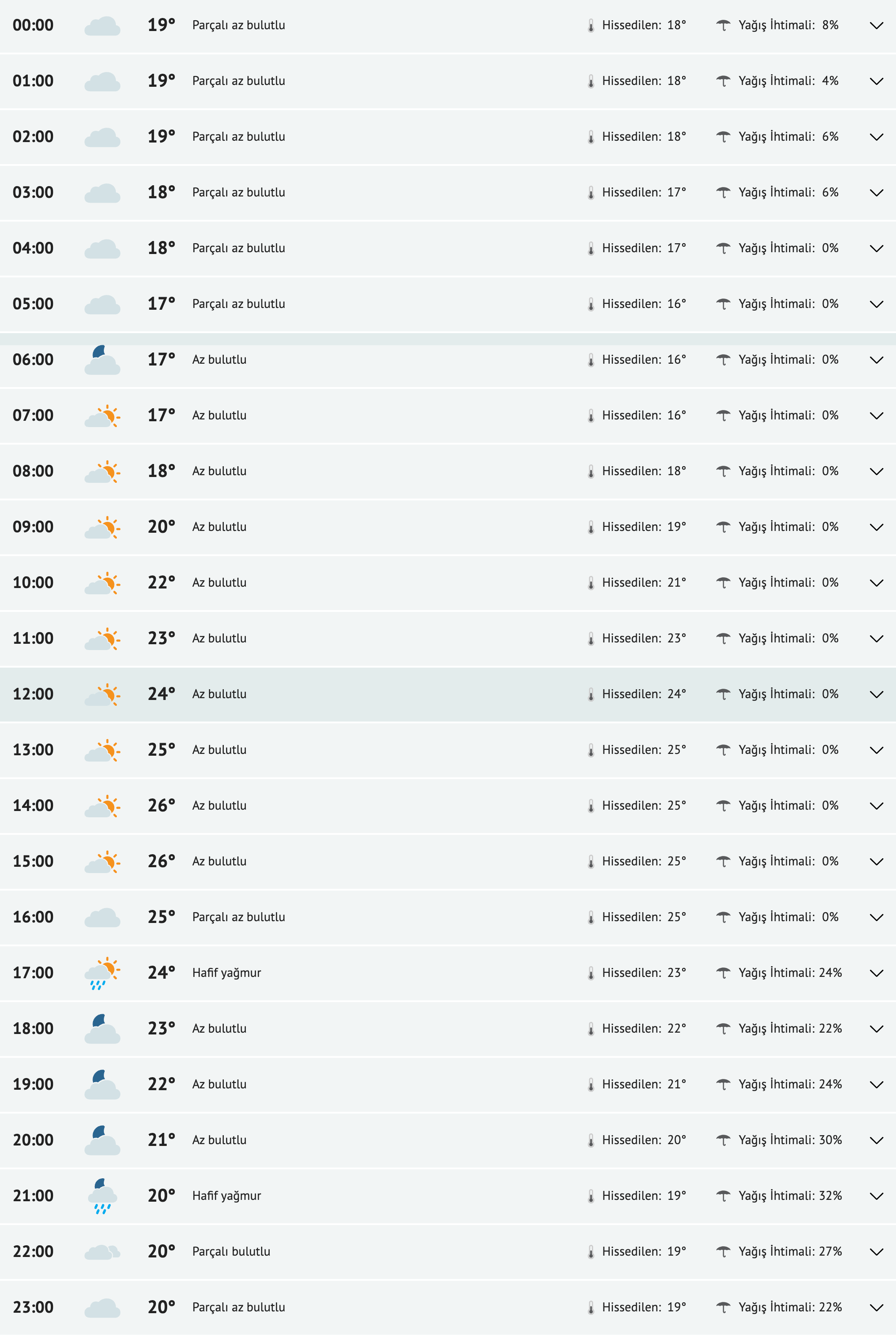 Havanın hafif yağmur, en yüksek sıcaklığın 26° ve en düşük sıcaklığın 17° olması bekleniyor.